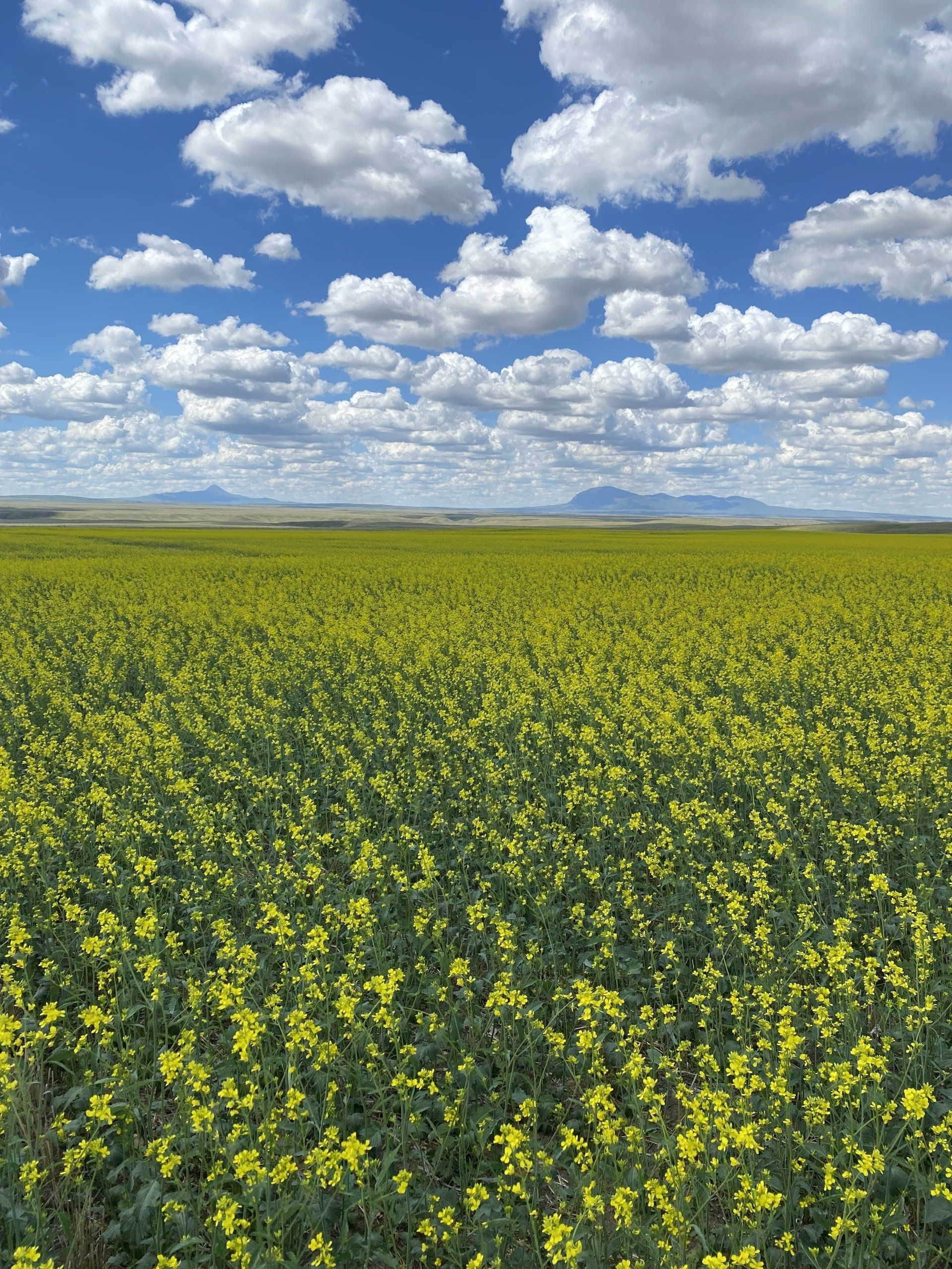Beautifully flowering Hybrid Mustard crop despite drought conditions in 2021. Iconic Sweetgrass hills and USA in the distance.