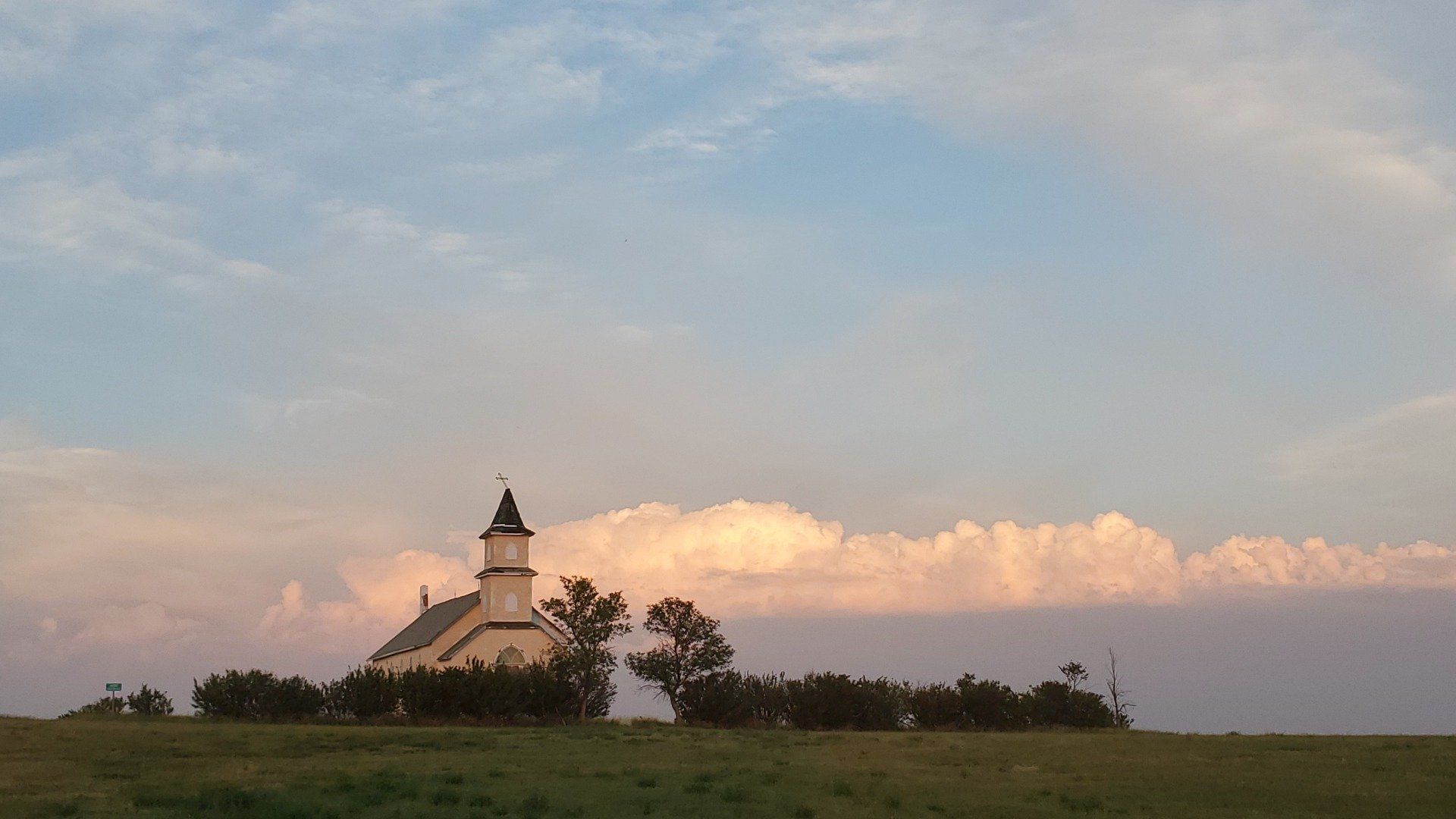Thunder storm cell near Hoping with Sacred Heart Church to the right.
