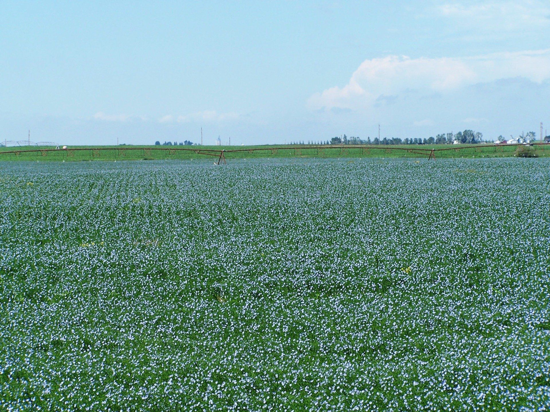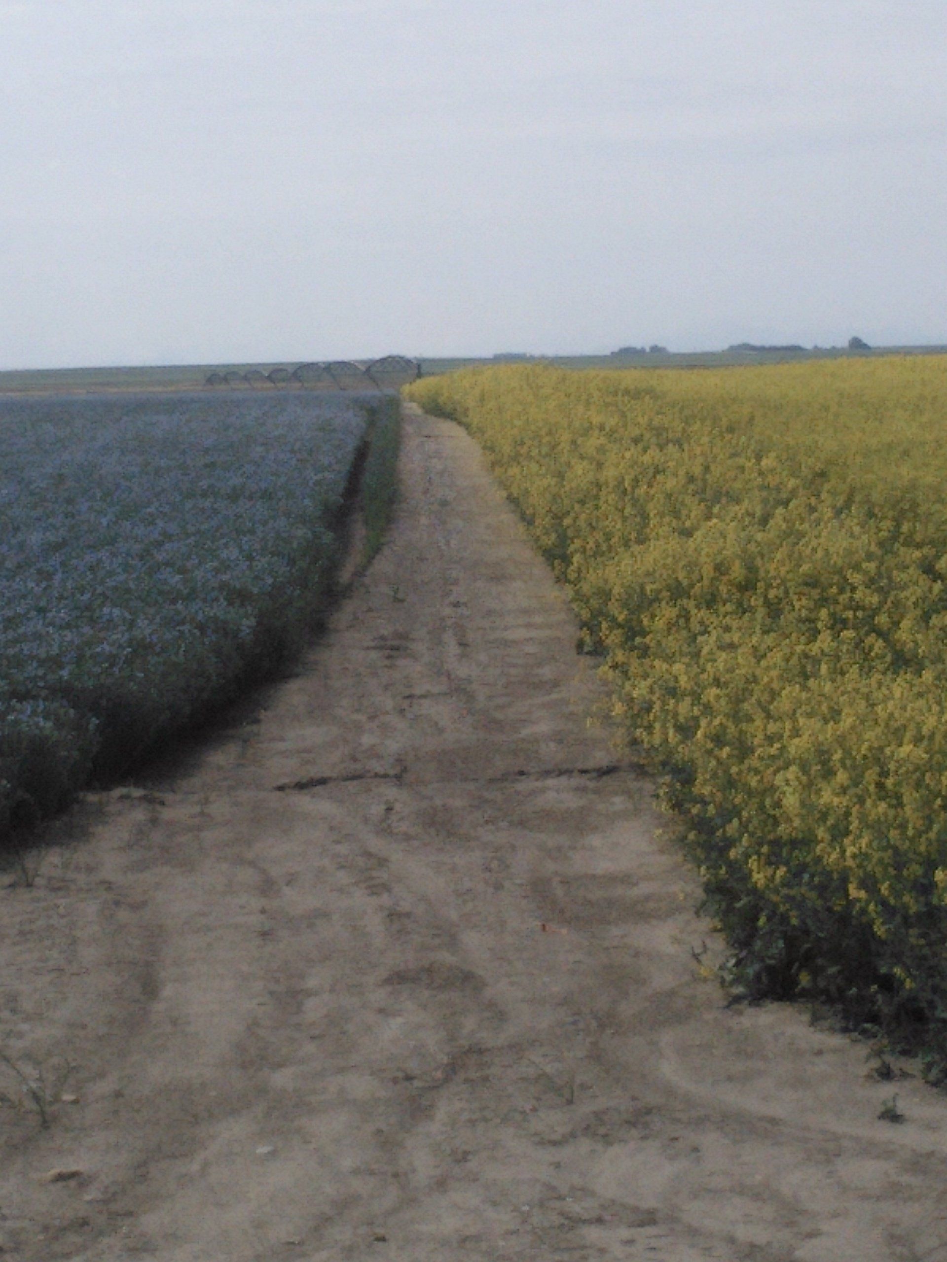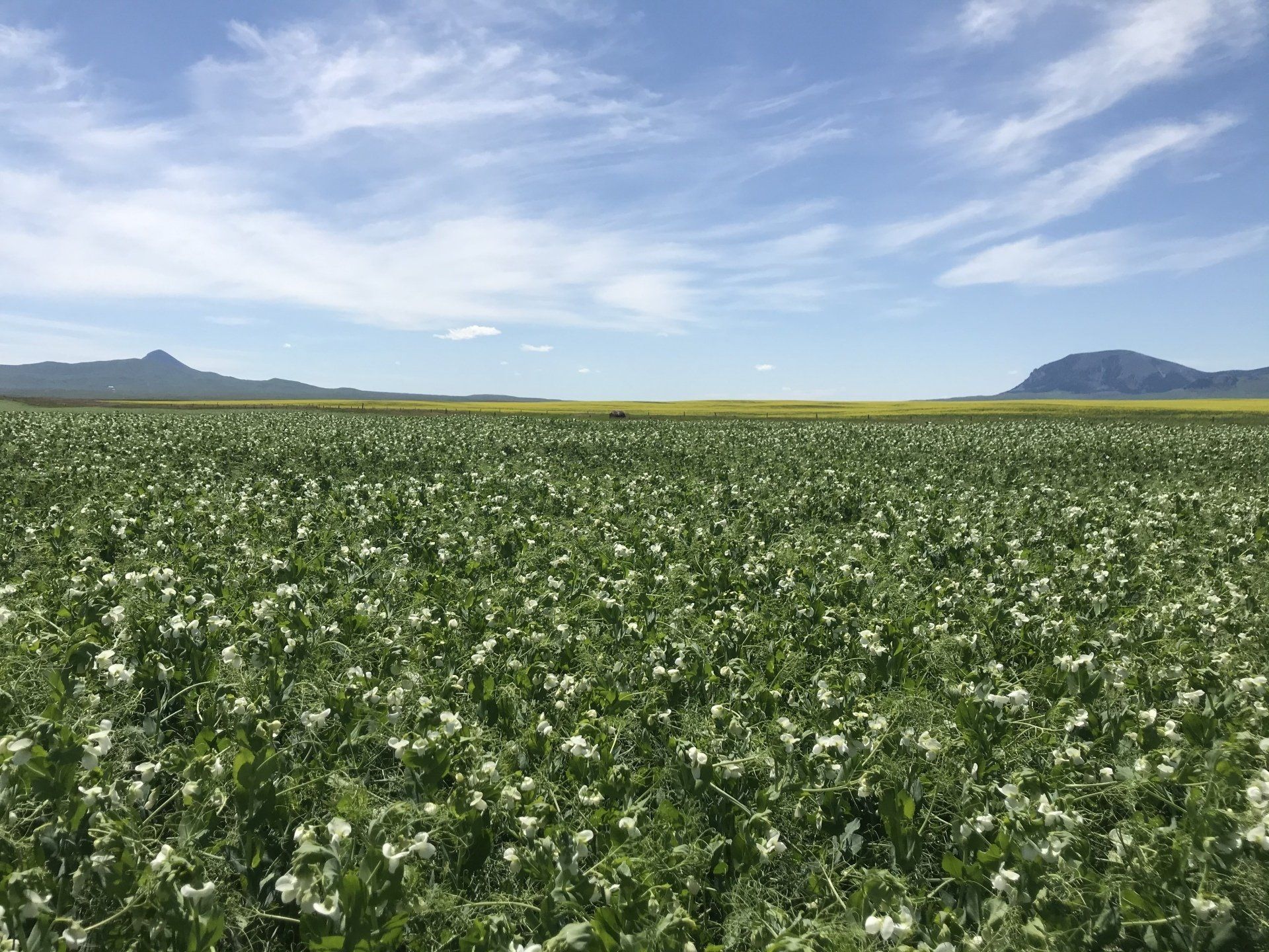 A flowering Yellow Pea crop in 2020 facing the iconic Sweetgrass hills: the yellow in the distance is in the USA.