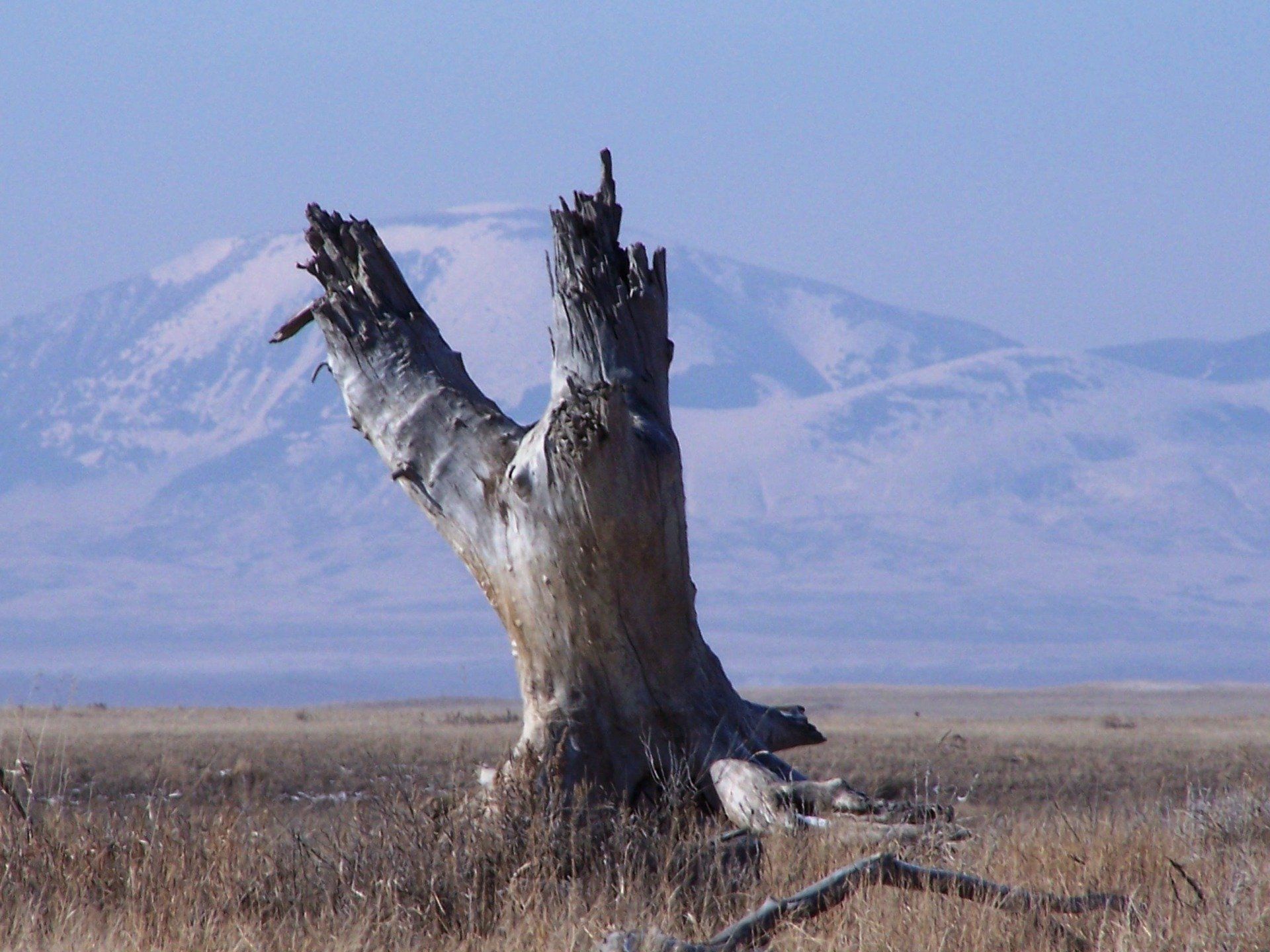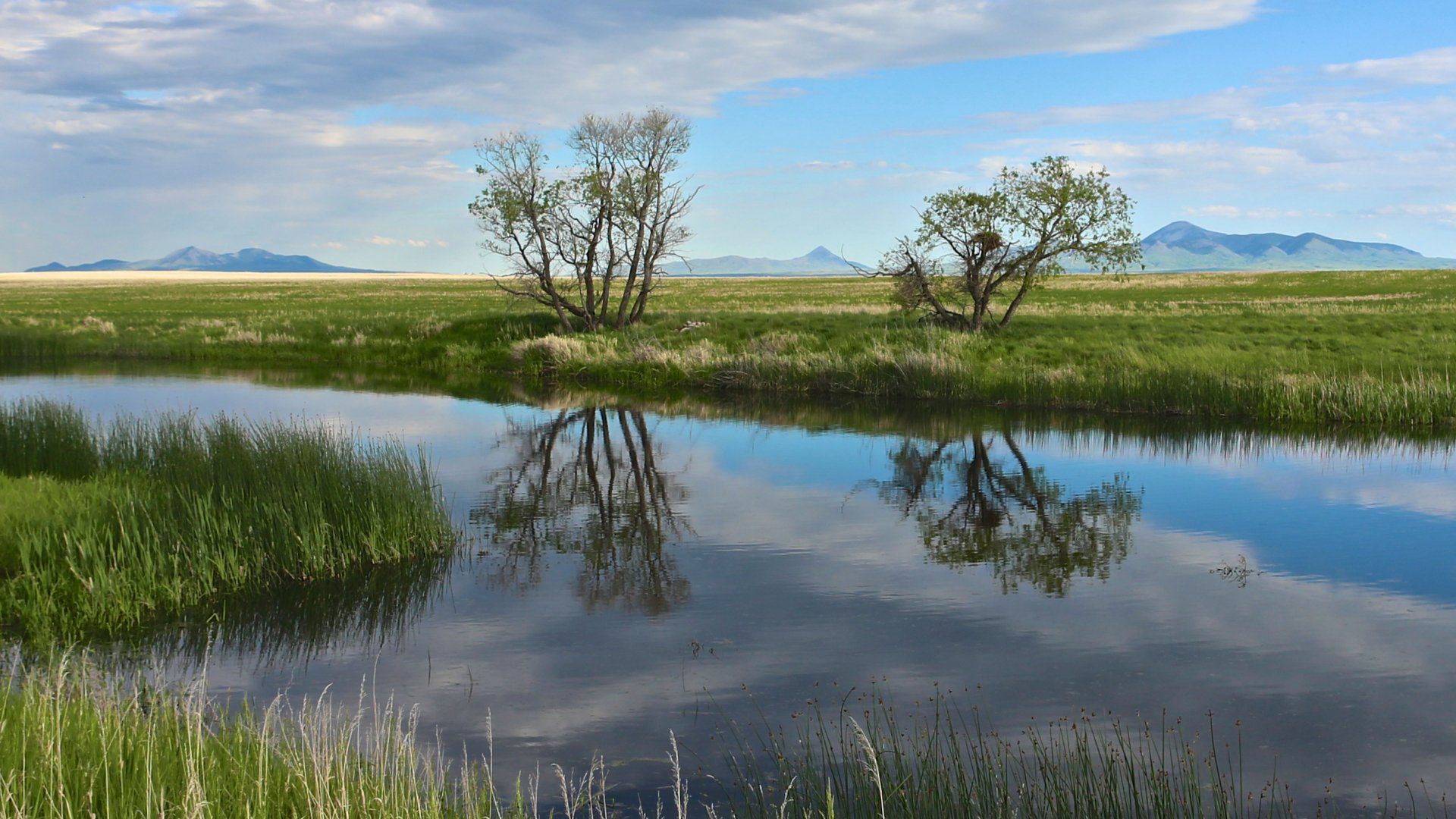 View of Sweetgrass Hills with tree reflection near Kings Lake.